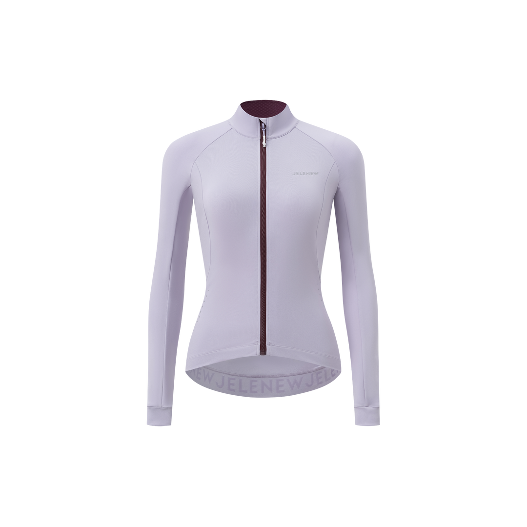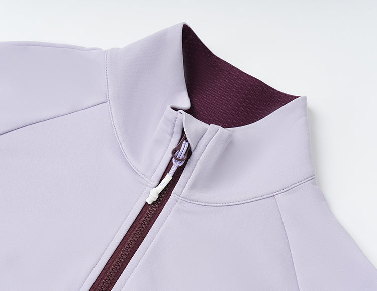 women's high performance cycling jersey with stand-up collar and long sleeves in light purple